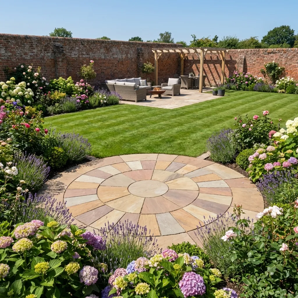 • A Camel Buff 4 Meter Circle - 22mm Calibrated stone patio features a wooden bench and potted tree, surrounded by blooming hydrangeas, lavender, and lush green grass in a beautifully landscaped sunny garden.