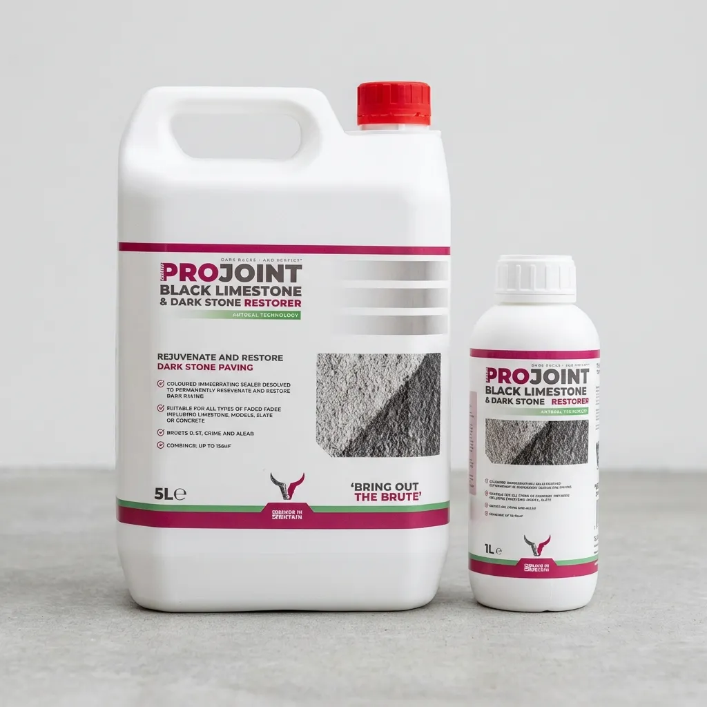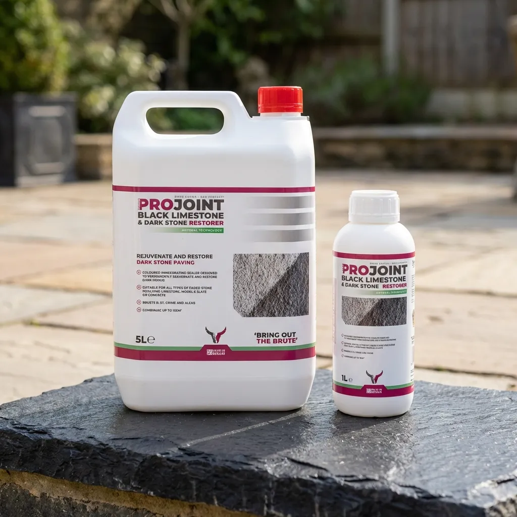 • Two bottles of PaveCare Black Limestone Restorer & Sealer (5L and 1L), both in white containers with red caps and a label showing product info and textured stone imagery, are placed on a grey surface.